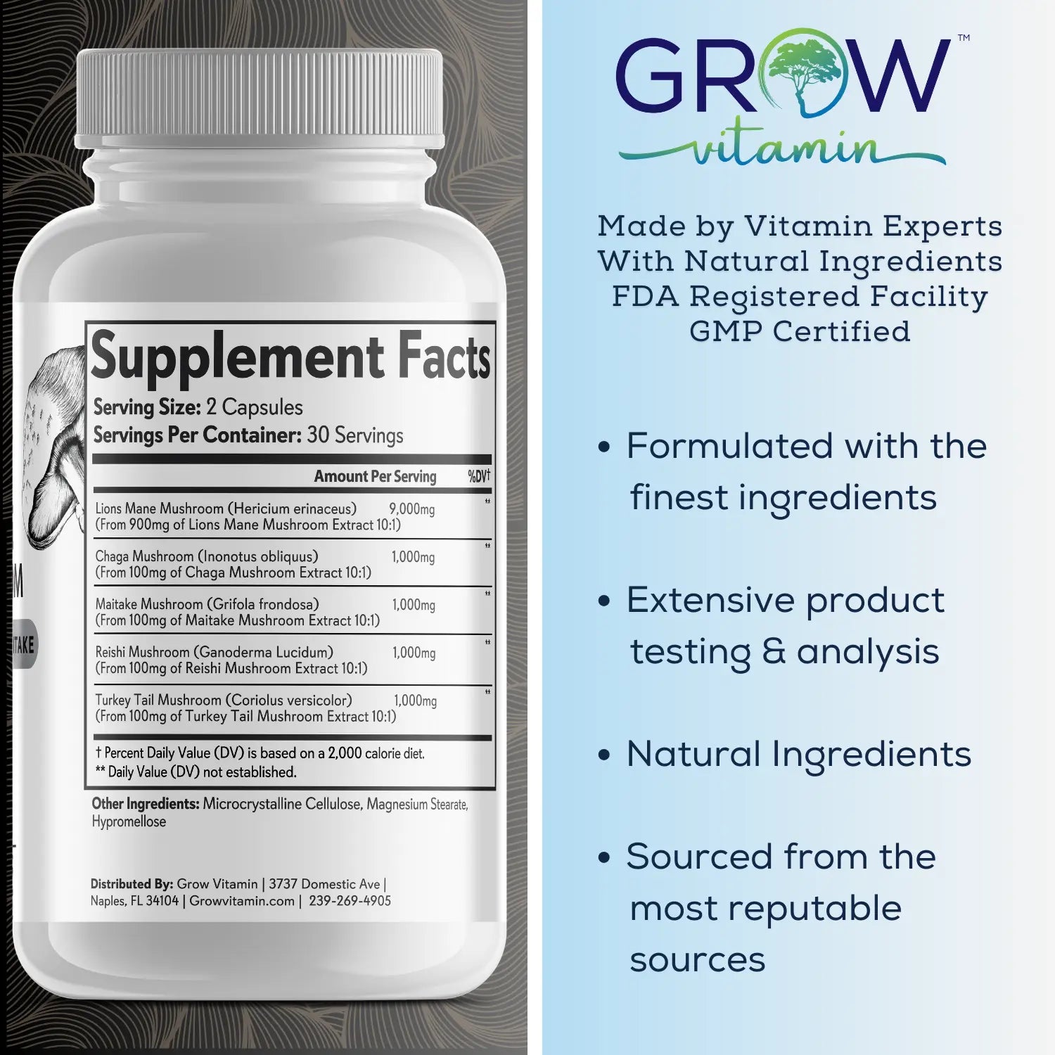 5 Premium Mushroom Extracts โ Includes Lions Mane, Chaga, Turkey Tail, Reishi, and Maitake for comprehensive wellness.