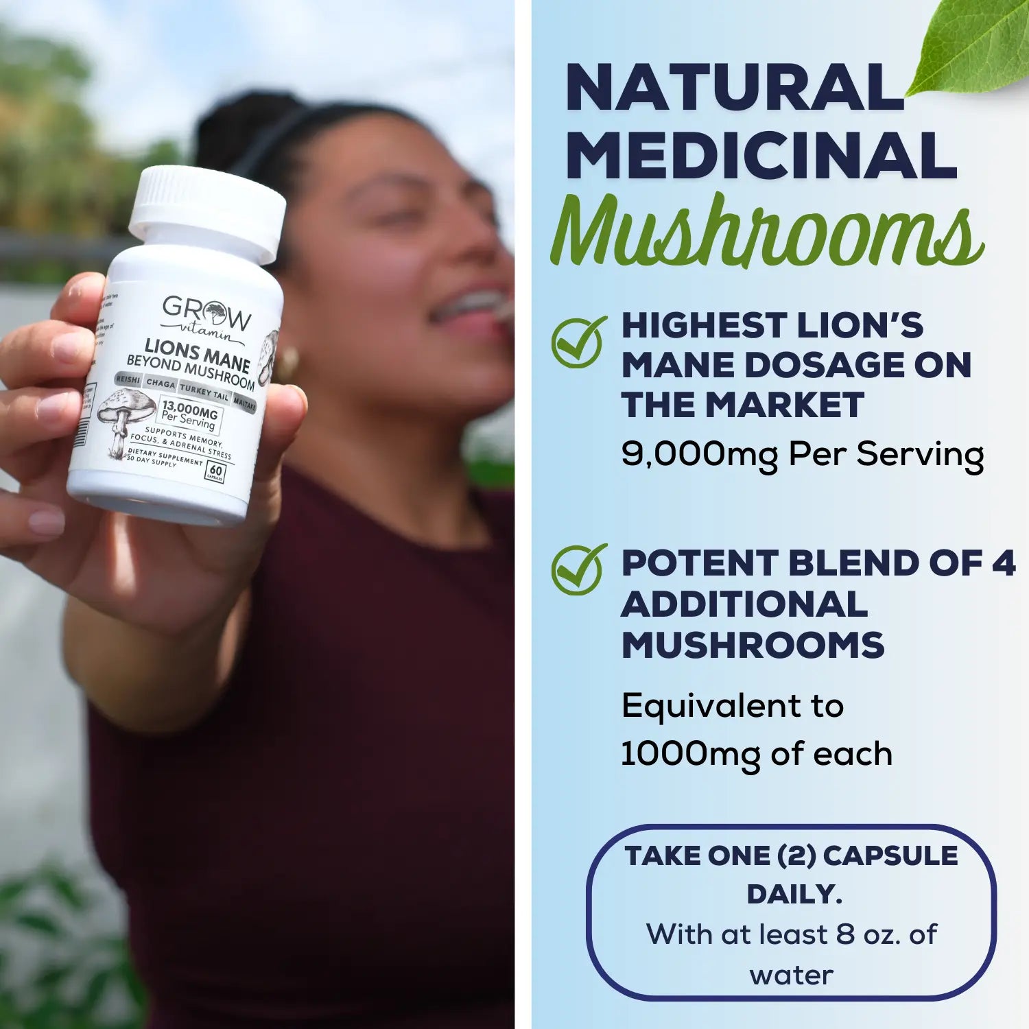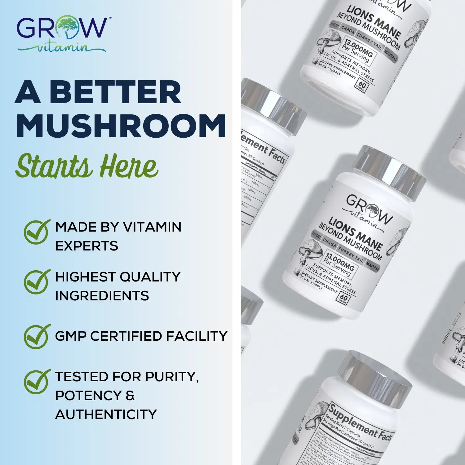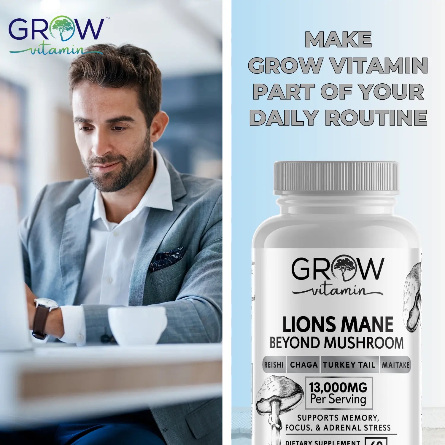 Unlock Your Full Potential with GROW Lions Mane Beyond Mushroom, a powerful blend of 5 premium mushrooms designed to support cognitive function, memory, focus, and adrenal health. With an ultra-potent 13,000 mg per serving, this formula delivers science-backed benefits for mental clarity, energy, and stress resilience.