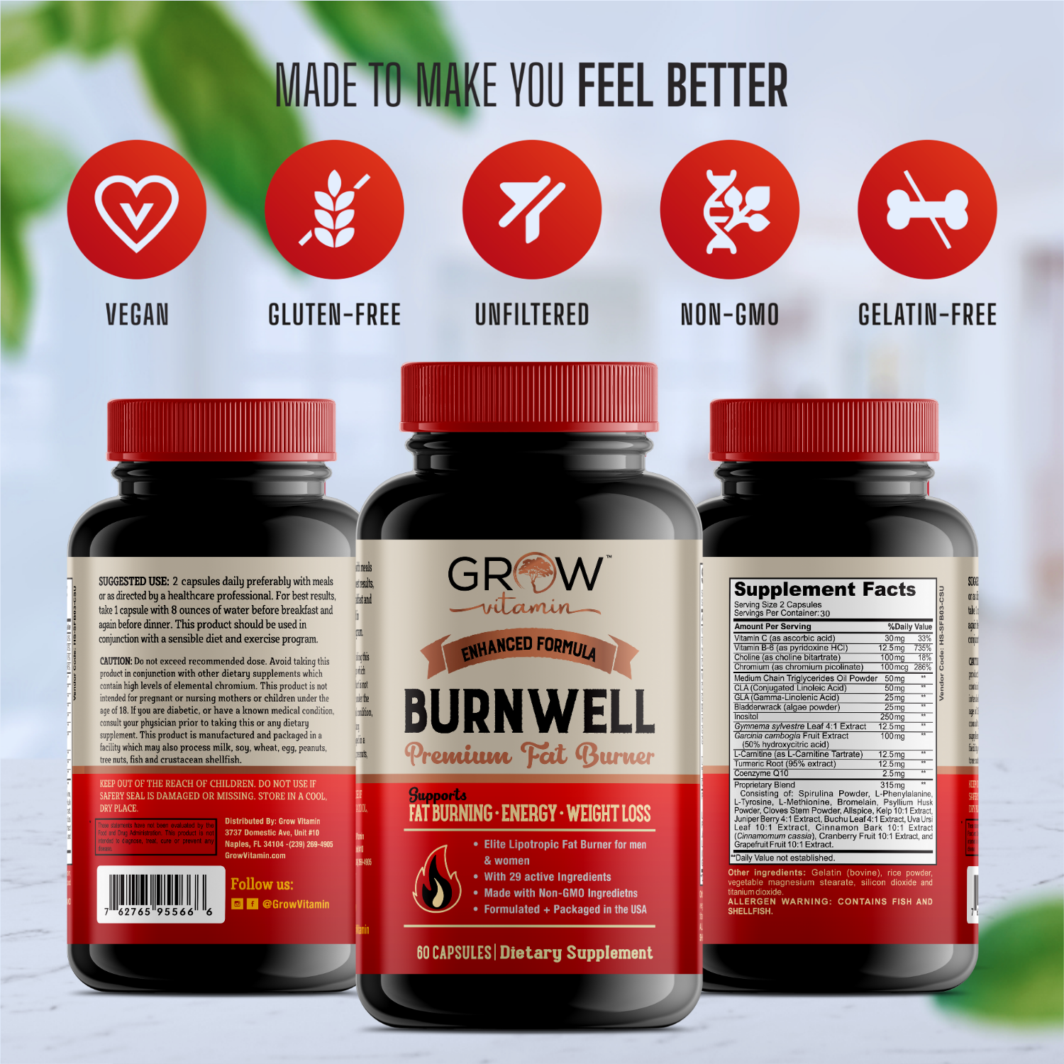 Ignite your transformation with Burnwell Premium Fat Burner — a next-level formula designed to burn fat, energize your body, and support sustainable weight management. Backed by 29 active ingredients, including CLA, Garcinia Cambogia, L-Carnitine, and CoQ10, Burnwell helps you stay lean, focused, and motivated day and night.
