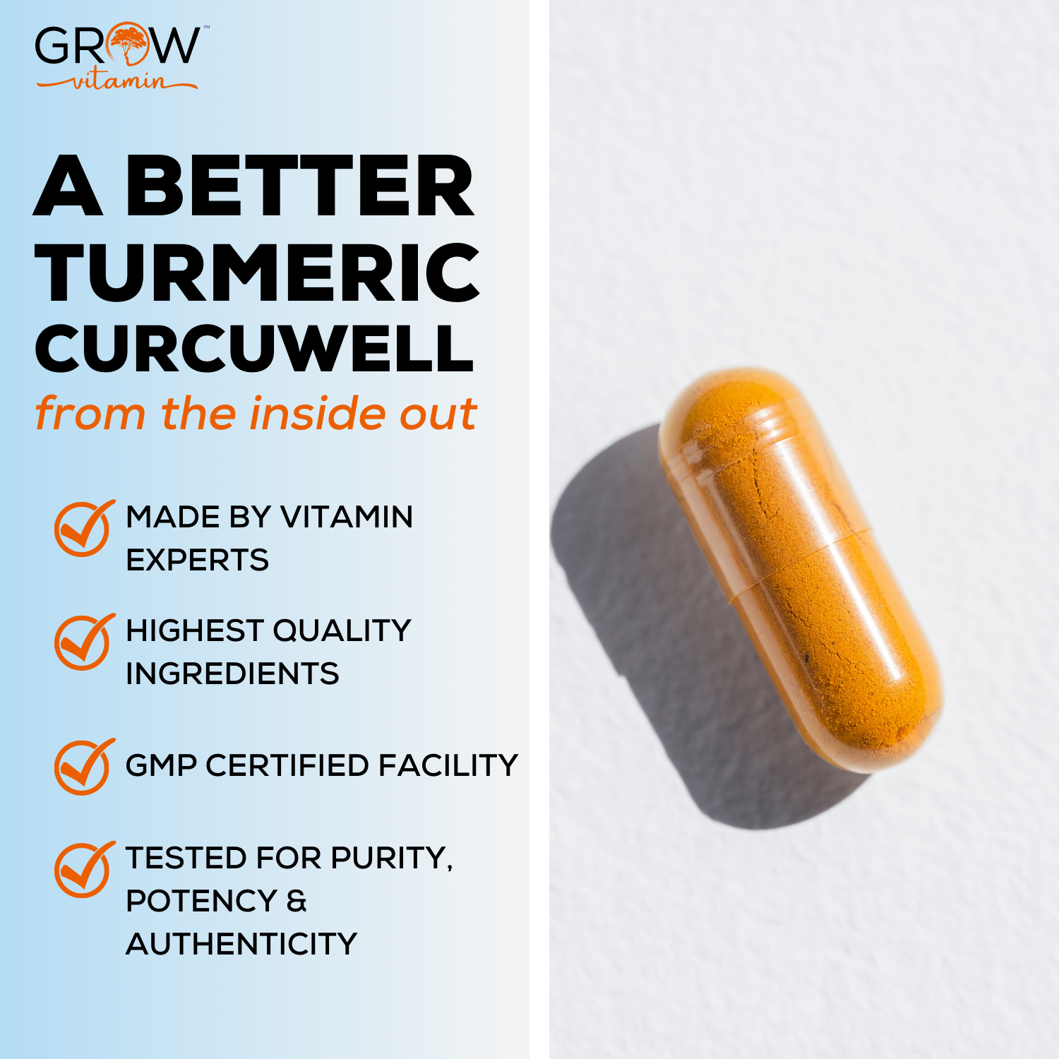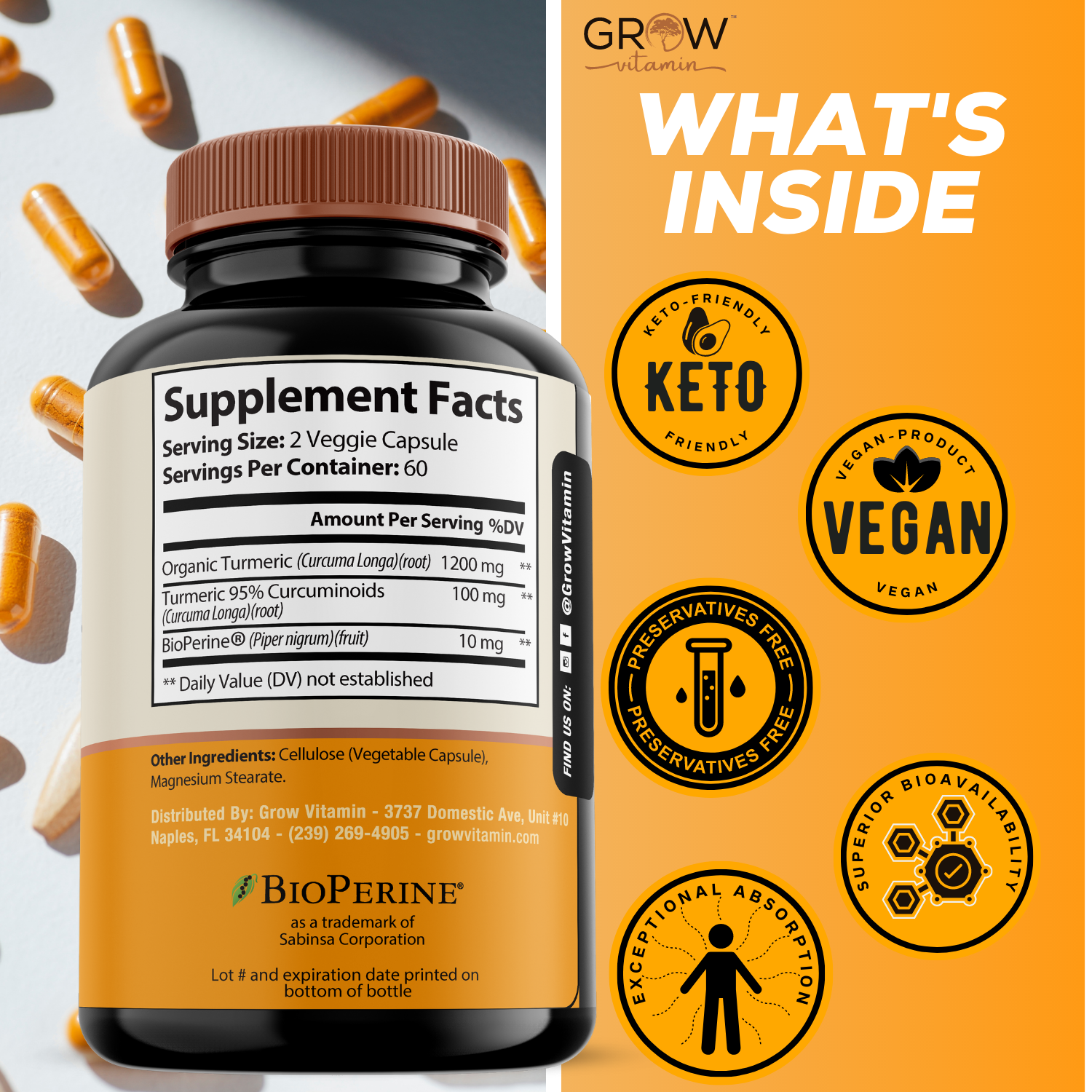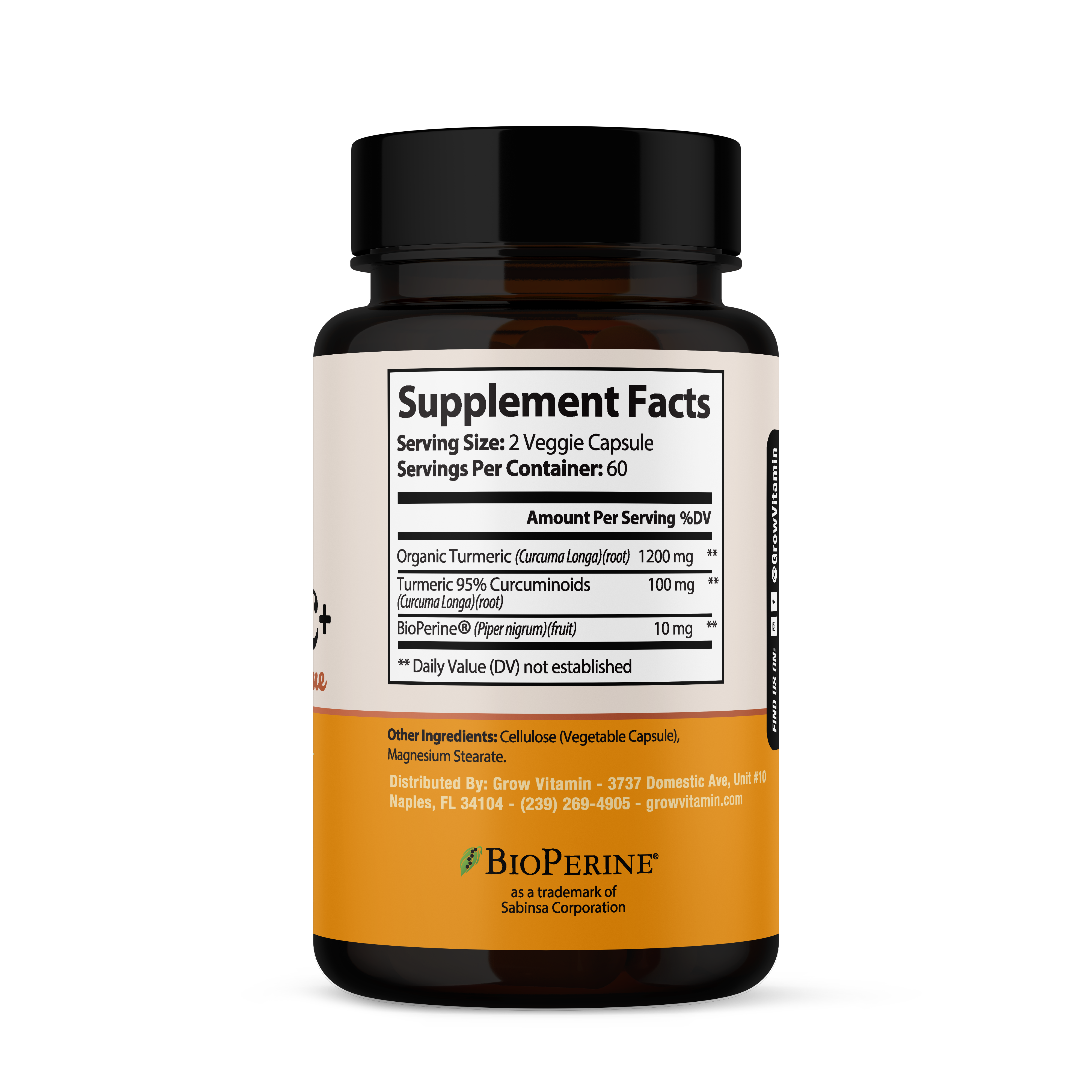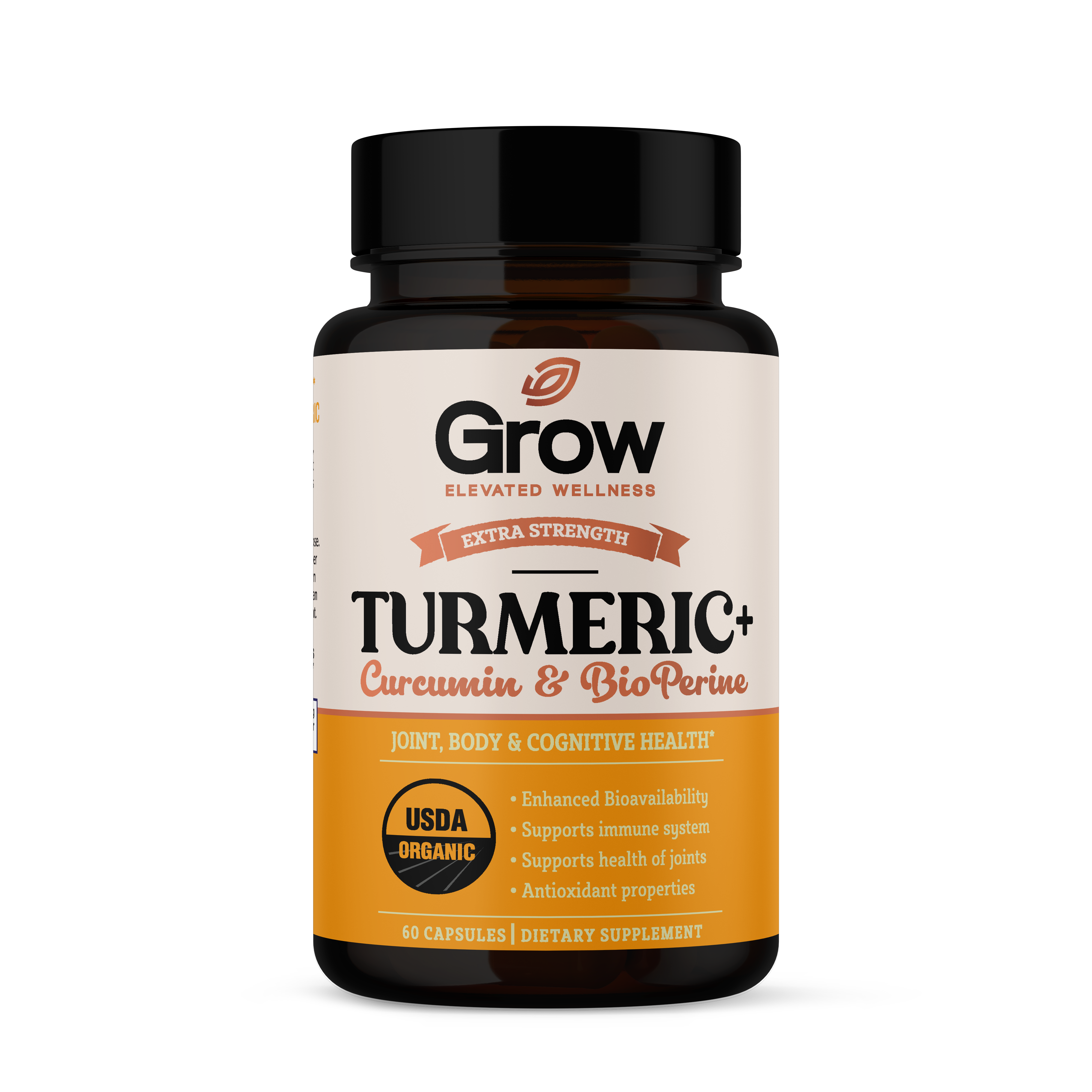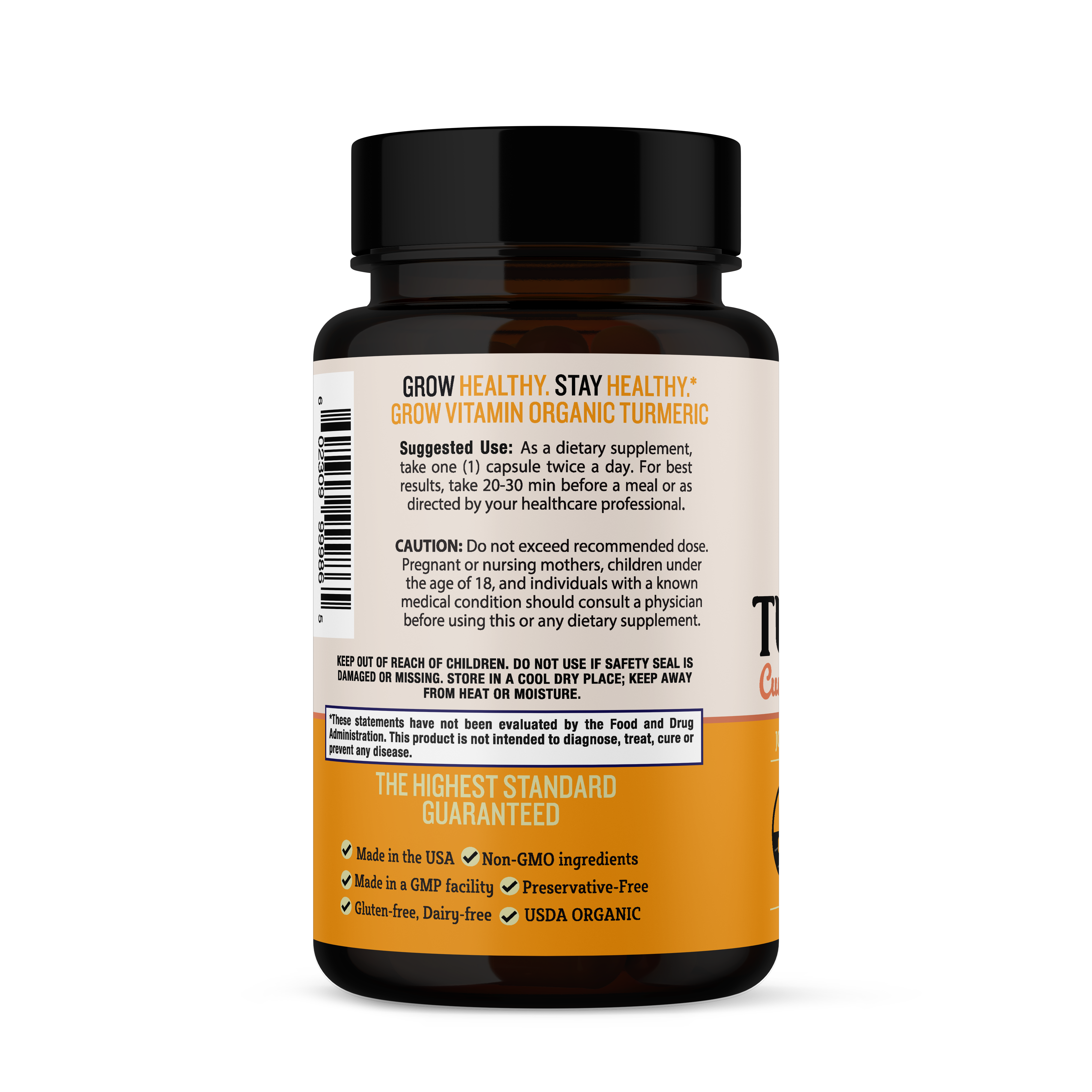 **Grow Vitamin Organic Turmeric** combines organic turmeric root, standardized 95% curcuminoids, and BioPerine® for absorption. A clean, vegan capsule designed to support joint comfort, a healthy inflammatory response, and overall mobility—made with Non-GMO ingredients in a GMP-certified facility.