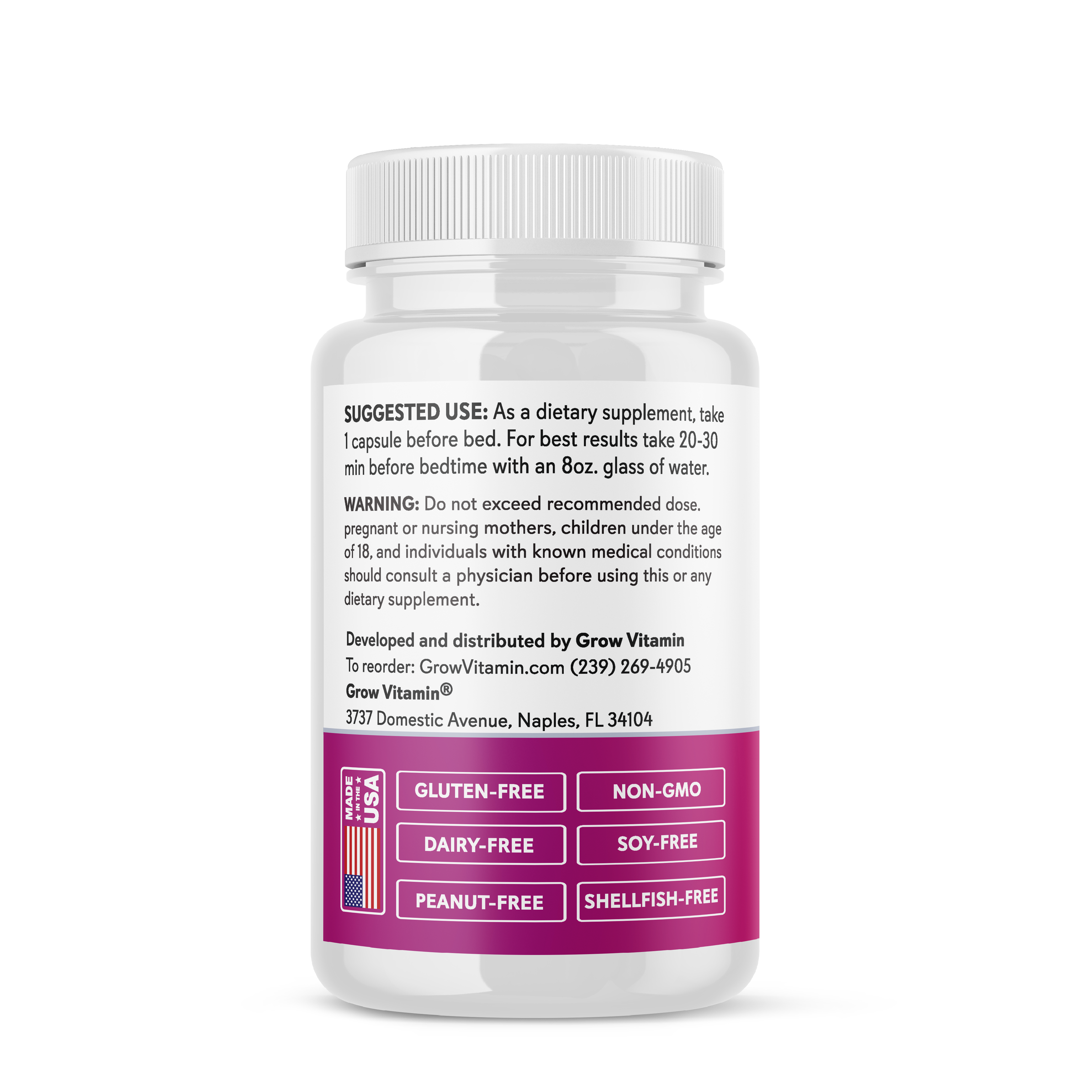Caution: Adults only. Do not exceed the recommended serving. Not intended for pregnant or nursing women. If you have a medical condition (especially endocrine, hormonal, or psychiatric conditions), are taking prescription medications, or have questions about using a sleep-support supplement, consult your healthcare professional before use. Discontinue use and consult a physician if you experience any adverse reactions. Keep out of reach of children.