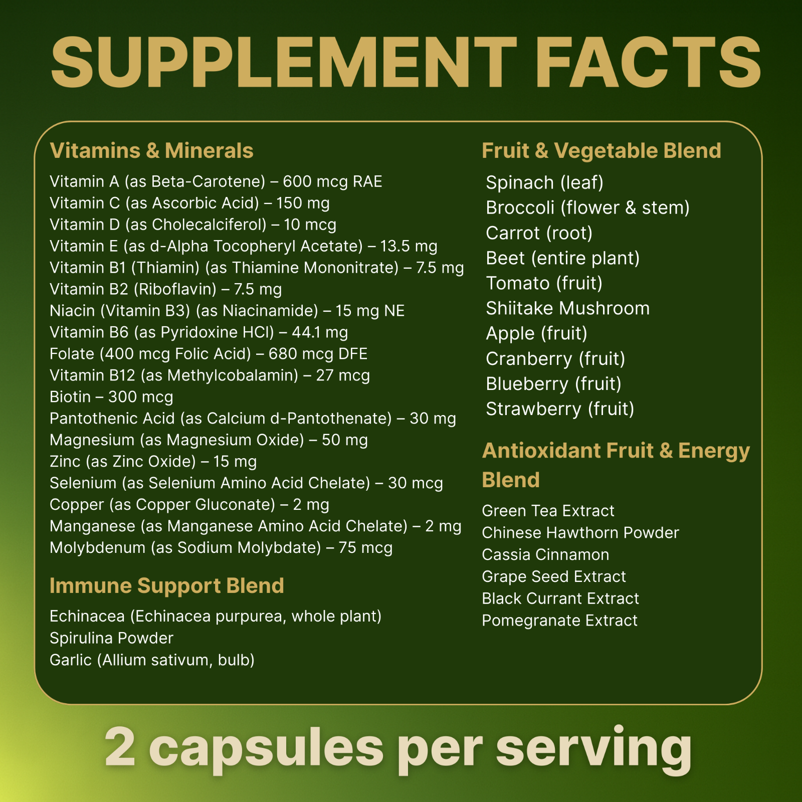 Our Whole Food Multivitamin is crafted with a carefully selected fruit and vegetable blend that provides naturally occurring vitamins, minerals, and antioxidants. The formula is enhanced with advanced mineral complexes and metabolic support ingredients to help optimize nutrient absorption and utilization.